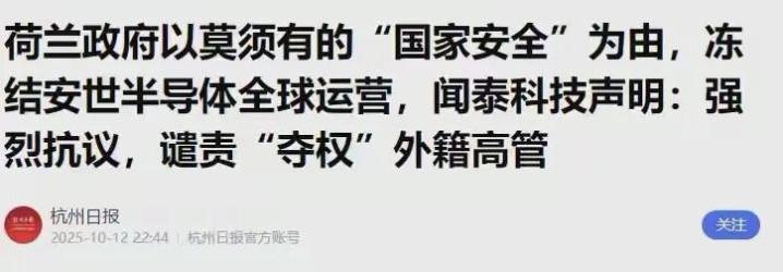 时间回到2025年10月,闻泰旗下安世半导体突遭黑手。